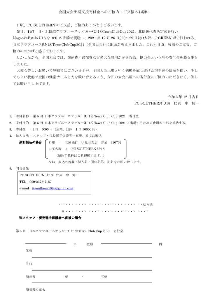U-18 全国大会出場支援寄付金へのご協力・ご支援のお願い