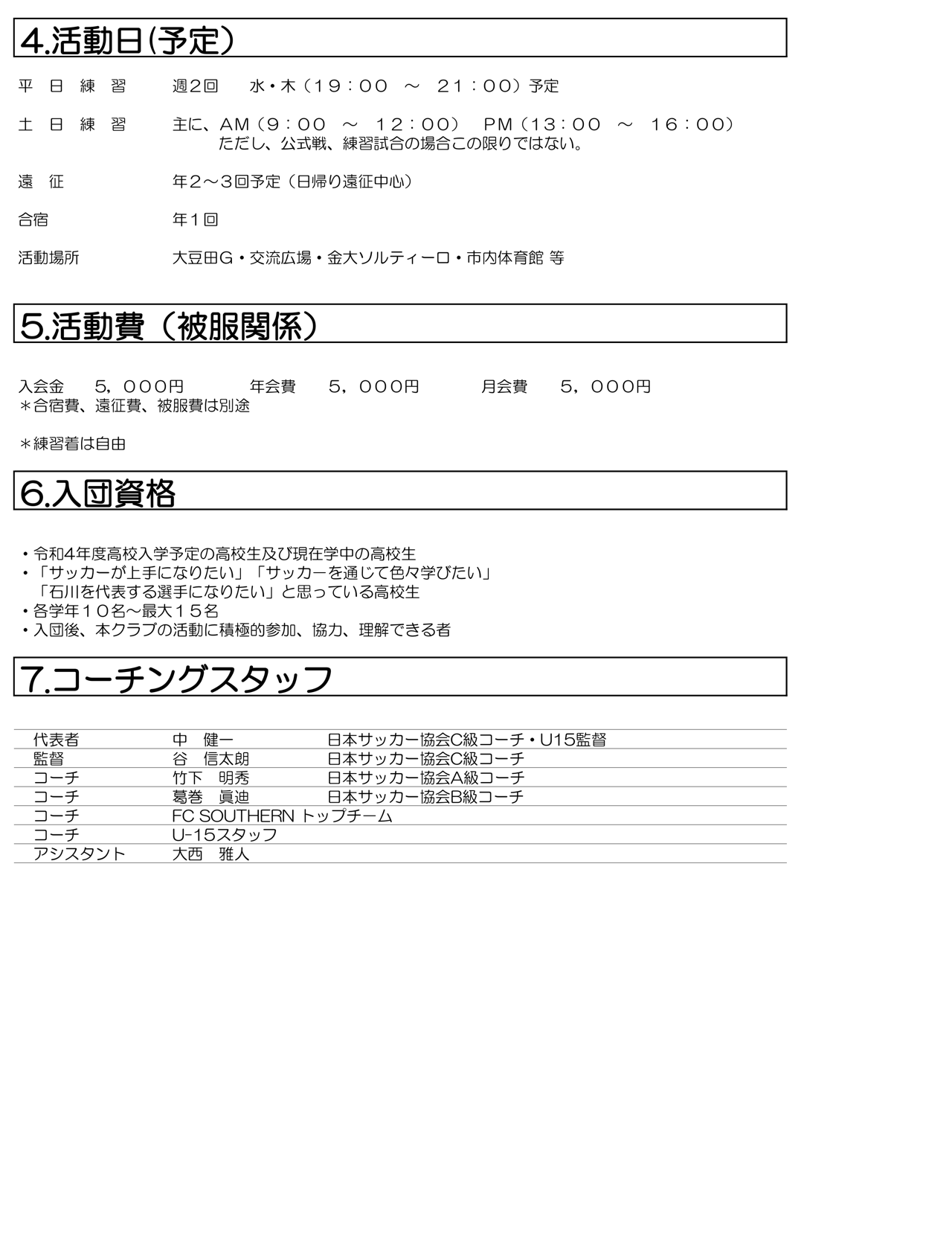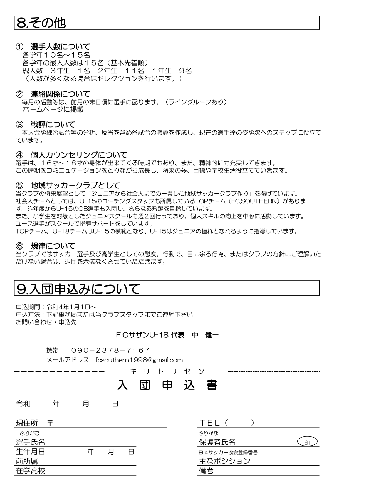 NEWS 2022.01.11 令和4年度 U-18入団生募集 令和4年度U-18入団生を募集しております。 入団希望の方は、 FCサザンU-18代表 中 健一 090-2378-7167 までご連絡ください。 入団申込書をコピーしご記入ください。